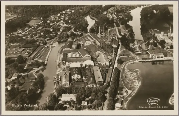 • Flygfoto över Motala Verkstad på Kvarnön i Motala. Till vänster om ön ligger Göta Kanal och till höger Motala Ström.
