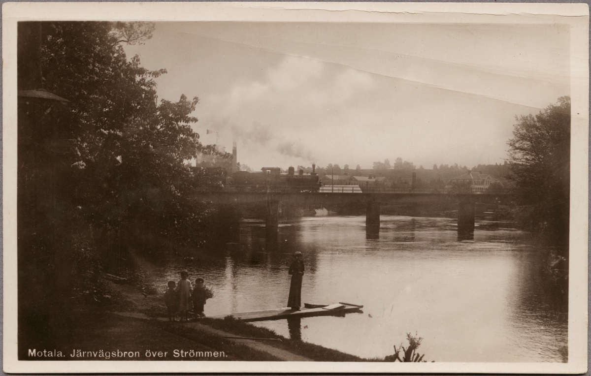 Vy på järnvägsbro över Motala Ström mellan Motala och Frebergaviken med kvinna och barn vid strandkanten.
