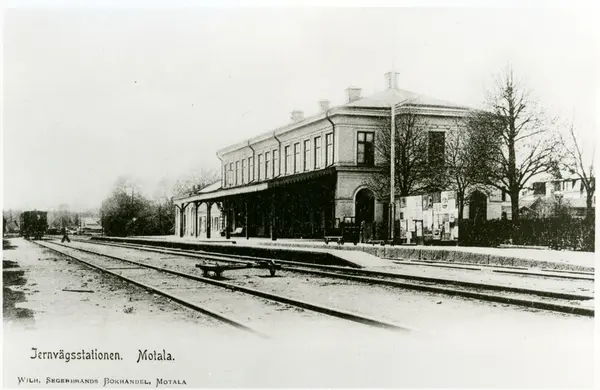• Kopia av vykort av järnvägsstationen i Motala av Wilh. Segerbrands bokhandel Motala.
