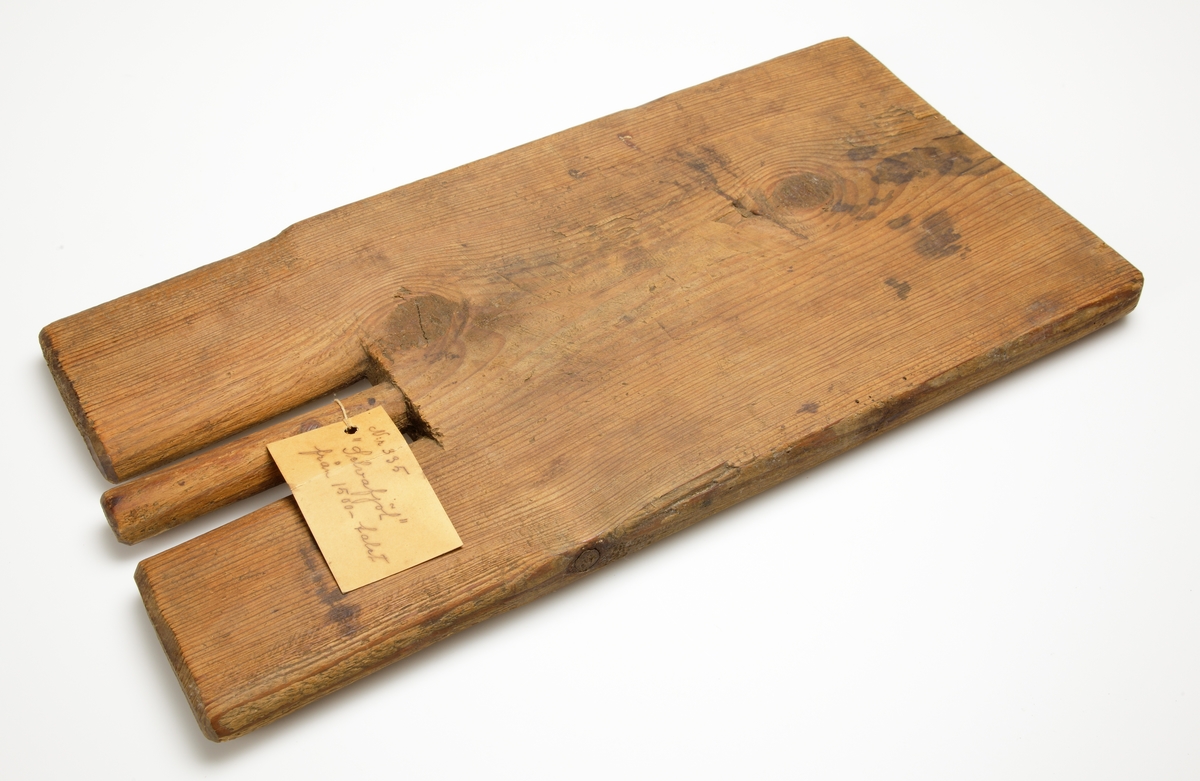 • En avlång bräda. Vid ena kortsidan ett hack, mitt i detta skjuter en smal pinne upp med oval genomskärning. Pinnen i jämnhöjd med brädans kant.