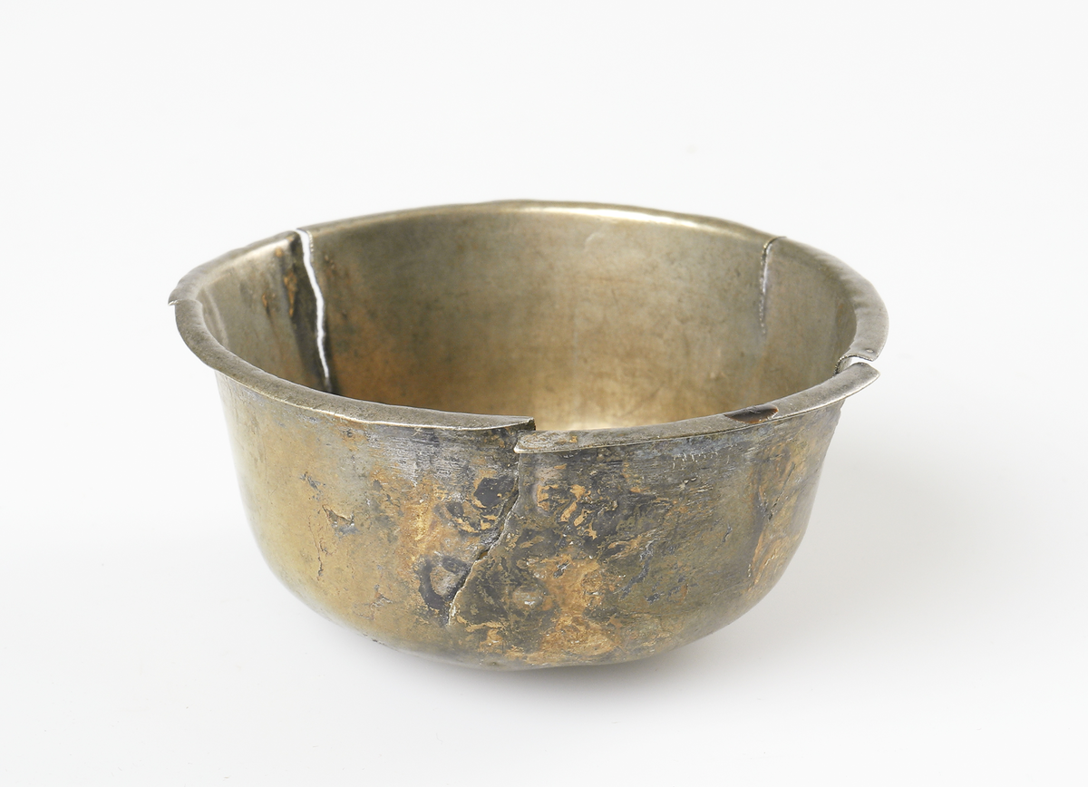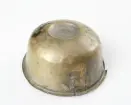 Tumlare av mässing. TIllverkad av tunn mässingsplåt som har varit försilvrad. Halvklotformig med utvikt mynningskant. Utan dekor. I botten en liten bucka, för att kunna stå stadigt.