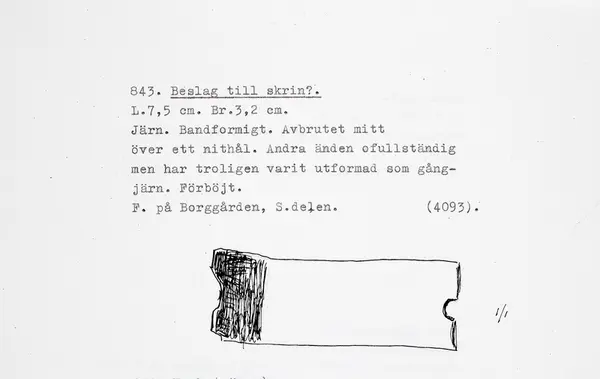 • Bandformig beslag till en mindre kista eller ett skrin (?). Avbrutet mitt över ett nithål. Andra änden ofullständig, men har troligen varit utformad som gångjärn.