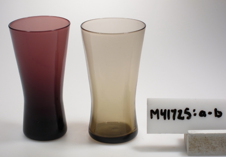 Brännvinsglas tillhörande servis "Sexan". Formgiven av F. Lundquist. Ritning finns i arkivet. Tillverkad på Trelleborg glasbruk. (Gull. övertog 1955). Beskrivning: Konisk vid botten. Konisk överdel. Färg:A: Lila underfång B: Brunt underfång Mått: Ovan anges mått för höjd och övre diameter. Bottendiameter: 31mm. Inskrivet i huvudkatalogen 1980. Funktion: Brännvinsglas