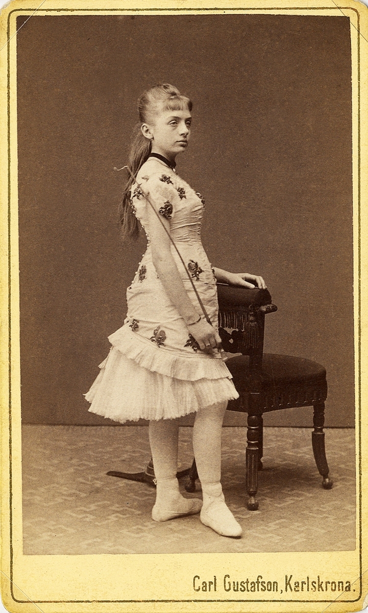 Cirkusprimadonna. Fröken Rose Hacke (?) (enligt text på baksidan) i scenkostym. 1880-tal. Helfigur, halvprofil. Ateljéfoto.