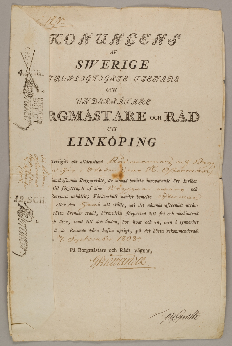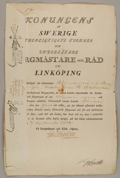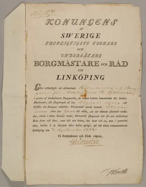 Ett pass som ger tillstånt för en inrikes resa. Två pappersark varav det ena omvikt det inre med sjäva tillståndet. Passet är till större delen förtryckt men de specifika detaljerna är ditskrivna för hand med bläck. Stämplat.