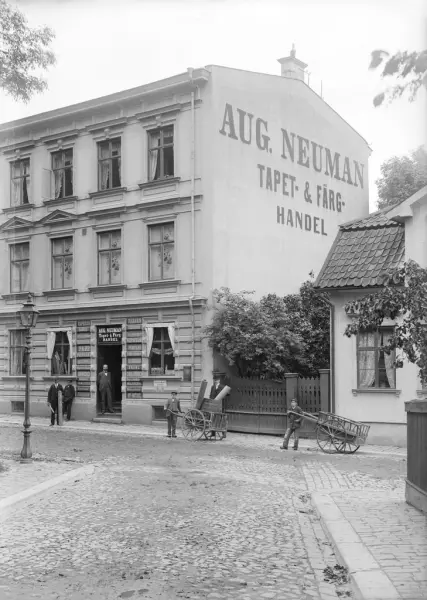 En svunnen miljö i Linköping som sedan länge utraderats. Annonseringen mot brandväggen ger oss ledning och placerar motivet vid korsningen av Apotekaregatans löp mot Ågatan. Bakom väggens budskap finner vi målarmästaren August Neuman, som år 1886 fått tillstånd att uppföra fastigheten. I gatuplanet drev han sin tapet- och färghandel. Vid tiden för bilden rörde man sig nära sekelskiftet 1900 och då hade firman övertagits av sonen Gustaf. Sannolikt är det honom vi ser i butikens dörröppning omgiven av firmans personal. I bildens högerkant skymtar Huitfeltska gården som nedmonterades 1949 för transport till Gamla Linköping.