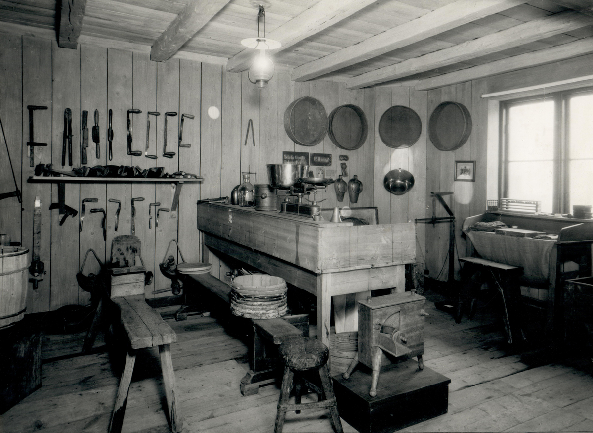 Svenska Tobaksmonopolets museum, interiör. I förgrunden, tillverkning av snuskaggar m.m. Vid fönstret står cigarrmakarens arbetsbord.