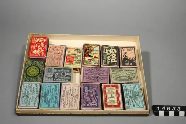 Grupperingspost för en samling tändsticksaskar, varav många med stickor bevarade, tillverkade i Sverige och de flesta andra tändsticksproducerande länder. Samlingen består av 116 lådor i vilka tändsticksaskarna är sorterade efter olika rubriker exempelvis länder. Nedan följer en lista på de 116 lådorna och de rubriker som står utanpå dessa. Fotografierna har samma nummer som respektive låda. Sammanlagda antalet tändsticksaskar är 1686 st. Antalet plån är 33 st. 1. Tyskland. 16 st. 2. Tyskland 20 st. 3. Ungern 12 st. 4. Finland 19 tändsticksaskar samt 1 plån. 5. Tyskland 18 st. 6. Japan 15 st. 7. Belgien. 3 tändsticksaskar + 1 rulle. 8. Indien 2 st 9. Turkiet, turkisk tillverkning 2 st 10. Tjecko-slovakiet 17 st. 11. Amerika 20 st. 12. Ryssland. Rysk tillverkning. För export. 17 st. 13. Italien. 6 tändsticksaskar + 2 plån. 14. Danmark H. E Gosch. 16 st. 15. Danmark H. E Gosch.. Utställningar Ritningar. 9 st. 16. Rovdjur. Svensk tillverkning f. exp. 15 st. 17. Sverige. Tretalet 31 st 18. Göteborg. Affärsföretag. Tretalet. 33 st tändsticksaskar + 1 plån. 19. Rariteter. 10 st + 1 plån. 20. Rariteter 14 st. 21. Välgörenhet & Utställningar. 7 st. 22. Tyskland. Reklam. 20 st + 1 plån. 23. Syd-Amerika 18 st. 24. Lifland. 2 st. 25. Norge. 15 st. 26. Kina. 5 st 27. Reklam. 3 tändsticksaskar + 2 st etiketter. 28. Tyskland. Tysk tillverkning. För exp.. 15 st. 29. Tyskland. 20 st 30. Tidaholm, Vulcan 20 st. 31. Sverige. Statsmän, européer. svensk tillverkning f. exp. 15 st. 32. "Äta eller ätas". Svensk tillverkning f. exp. 8 st. 33. Diverse. Svensk tillverkning. 18 st. 34. Sverige. Anneberg. Svensk tillverkning f. exp.. 18 st. 35. Krigiska motiv. Svensk tillverkning f. exp. 11 st. 36. Sverige. The Lancer. Ryttare. Svensk tillv. f. exp. 10 st. 37. Sverige. Blom-motiv. Svensk tillverkning f. exp. 8 st. 38. Orienten. Svensk tillverkning f. exp.13 st. 39. Diverse. Svensk tillverkning f. exp. 19 st tändsticksaskar + 1 etikett. 40. Sverige. Lidköping. "Sirius" Lidköping. Svensk tillv. f. exp. 18 st. 41. Sjöfart. Mynt. Sv. tillv. F. exp. 11 st. 42. England. Vaxtändstickor. 12 st. 43. Italien. Vaxtändstickor. 16 st. 44. Holland. 17 st. 45. Tjeckoslovakien - solo 19 st. 46. Schweiz 16 st. 47. Tyskland. 19 st 48. Estland. 7 st. 49. Österrike. 22 st. 50. Diverse Europeiska länder. 10 st. 51. Etikett + tryck i sverige. 18 st. 52. Tyskland. 19 st. 53. Wenersborg. Sv. tillv. f. exp. 14 st. 54. Sverige - The Ship. 14 st. 55. Sverige. Diverse. 10 st. 56. Fåglar. Sv. tillv. f. exp. 17 st. 57. Reklam. Svensk tillv. f. export.15 tändsticksaskar + 1 plån. 58. Fåglar. Sv. tillv. f. exp. 12 st. 59. Sverige. Kvinnofigurer. Svensk tillverkning för export. 13 st. 60. Hjärta, nyckel, blixt, krona. Sv. tillv. f. exp. 12 st. 61. Sverige. Jönköping. Skämt. 11 st. 62. Sverige. Jönköping, Nationaldräkter. 18 st. 63. Sverige. Förenade svenska tändsticksfabriker. 8 st. 64. England. Bryant & May. 12 st. 65. England. Bryant & may. 13 st. 66. ...nland. 18 st + 1 plån. 67. Algier. 17 st. 68. Kända svenska fabriker. 20 st. 69. Utländskt. Diverse. 13 st + 1 plån. 70. Ryssland. 20 st. 71. Frankrike. 13 tändsticksaskar + 3 plån. 72. Tjecko-Slovakiet. 14 st. 73. Tyskland. 18 st. 74. Sverige. Jönköpings västra tändsticksfabrik. 22 st. 75. Tyskland. Tysk tillverkning för export. 19 st. 76. Sverige. Kalmar. Malmö, Mönsterås. 5 st. 77. Ringen. Svensk tillverkning för export. 10 st. 78. ...sk tillv. f. exp. Trafik & samfärdsel. 12 st. 79. Sverige. Condor, Parrot, Cacadoe mfl. 10 st. 80. Djur, fyrfota. Sv. tillv. f