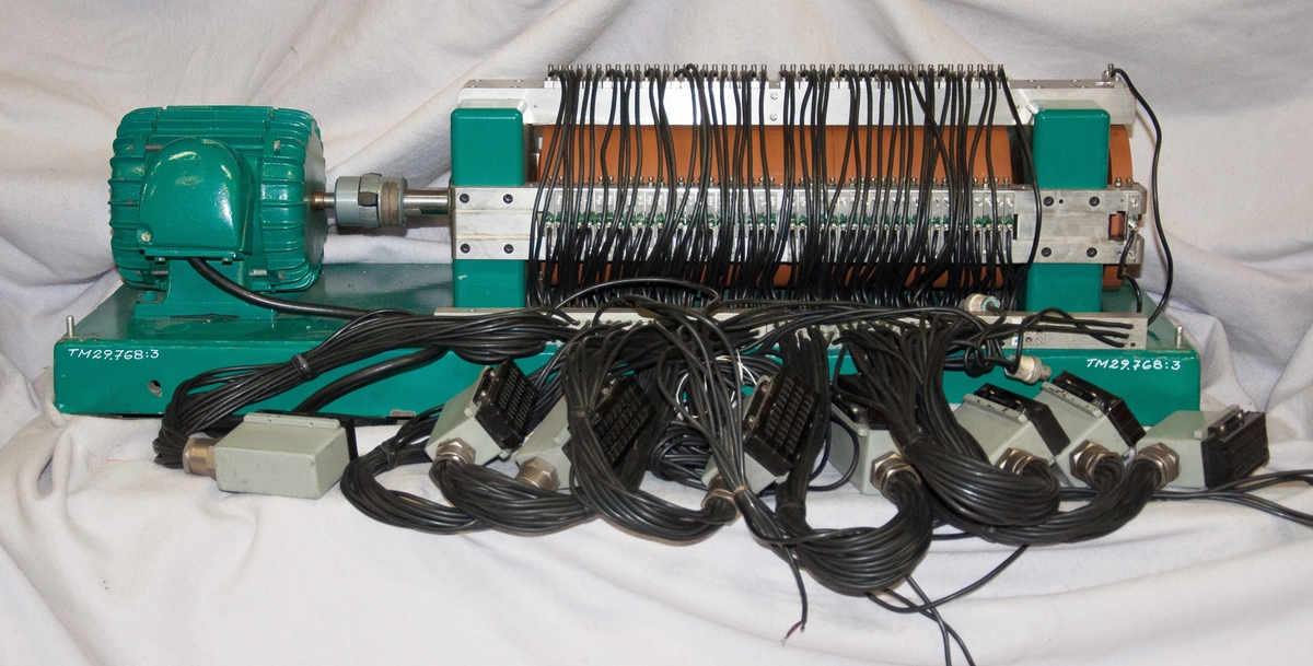 • BESK:s två trumminnen var monterade i botten på ett skåp som även innehöll elektronik för styrning. Fundament av gjutjärn. Två lagerhus mellan vilka trumman är monterad. Utmed trumman sitter läs- och... Visa hela