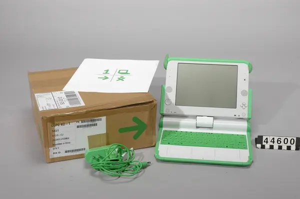 Bärbar laptop-dator, med originalkartong, laddare och bruksanvisning. Datorn har ingen hårddisk eller CD-läsare. Lagringsminnet är 1024 MB flashminne men extra minne eller diskar kan anslutas via USB. Den har inbyggd webbkamera och mikrofon. Man kan använda den hopvikt som e-bok, med kontroller för att bläddra vid skärmen. Gränssnittet är anpassat för barn och lämnar den traditionella skrivbords-symboliken med mappstruktur. Man skiljer inte mellan program och dokument, allt kallas för aktiviteter. Tangentbordet levereras med internationella tecken eller med thailändska, arabiska, spanska, portugisiska, västafrikanska, mongoliska, kyrilliska tecken samt tecken för urdu, ett språk i Pakistan eller amharic, ett semitiskt språk i norra Etiopien. Datorn kan ansluta till Internet via en trådlös uppkoppling. Om barnens skola har en trådlös anslutningspunkt till Internet kan alla som är tillräckligt nära koppla upp sig via den. Datorerna upprättar sedan automatiskt ett nätverk mellan varandra och genom att "hoppa" mellan datorerna när signalen längre. Datorn är tänkt att drivas av ett fjäderverk, dessutom finns både solcellsladdare och trampdriven generator.