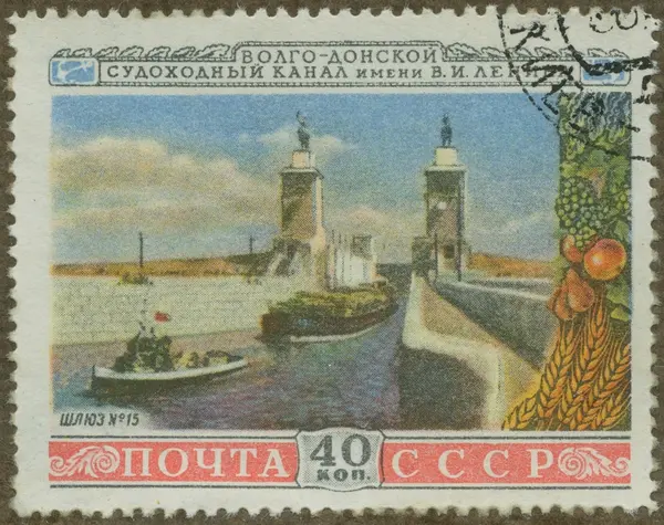 Titel <itemTitle> Frimärke med motiv av Volga- Don farledens kanal kallad Leninkanalen med Sluss N:o 15, från Ryssland, 1953.