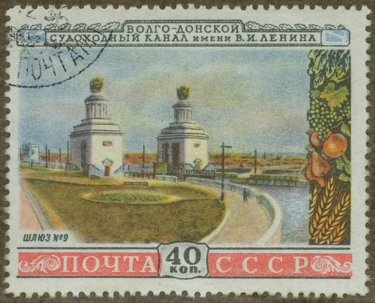 Frimärke ur Gösta Bodmans filatelistiska motivsamling, påbörjad 1950. Frimärke från Ryssland, 1953. Motiv av Volga- Don farledens kanal "Leninkanalen" Sluss N:o 9