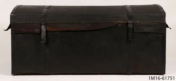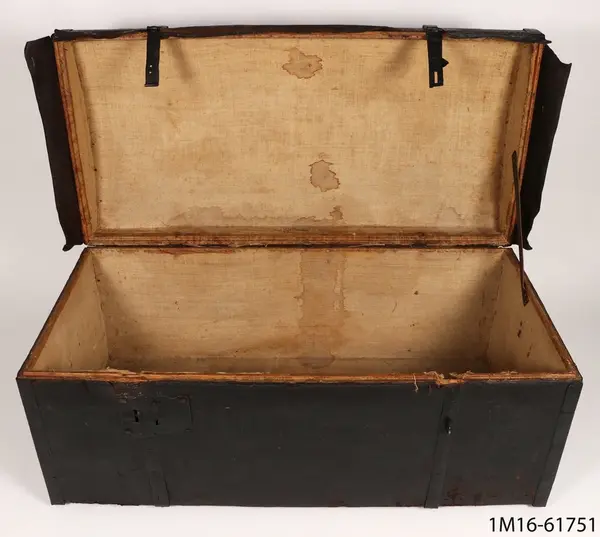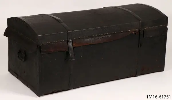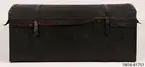 • Kista, skinnklädd, kupigt lock, enkla beslag, två lås, tyg inuti.