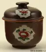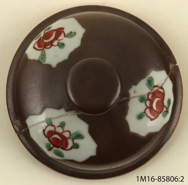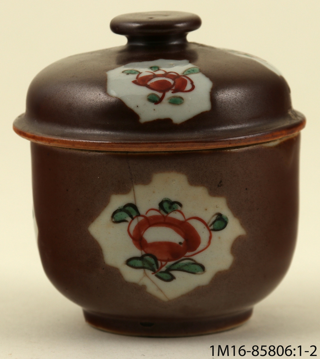• Lock toll skål, ostindiskt porslin; Brun med polykroma blommor i vita fält. Sprucken samt locket lagat.