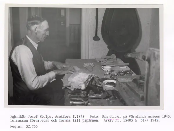 Fotodokumentation uppklistrad på fem kartongark, parvis, ensidigt, med tillhörande bildtext och källhänvisning. Dokumentationen beskriver tillverkningsprocessen för kritpipor. Fotokopiorna har storleken 11x17 cm.