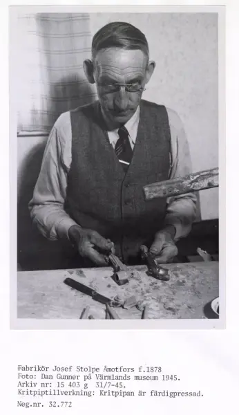 • Fotodokumentation uppklistrad på fem kartongark, parvis, ensidigt, med tillhörande bildtext och källhänvisning. Dokumentationen beskriver tillverkningsprocessen för kritpipor. Fotokopiorna har storlek... Visa hela