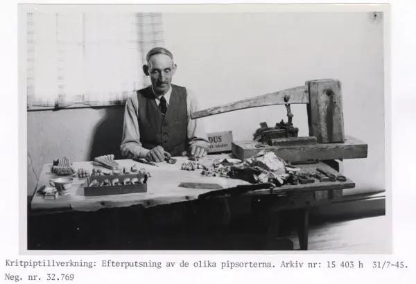 Fotodokumentation uppklistrad på fem kartongark, parvis, ensidigt, med tillhörande bildtext och källhänvisning. Dokumentationen beskriver tillverkningsprocessen för kritpipor. Fotokopiorna har storleken 11x17 cm.