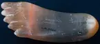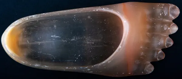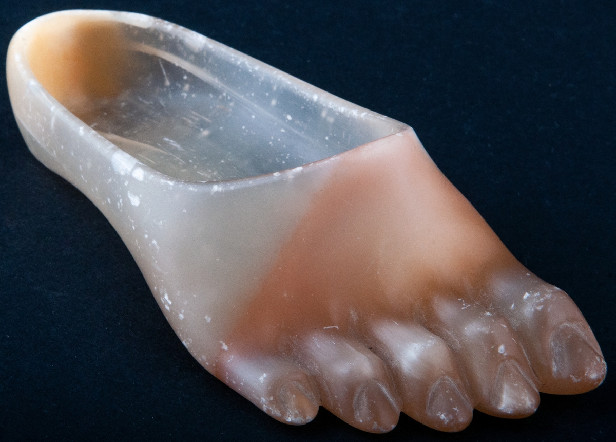 • Askfat, i form av en människofot, ihålig och öppen upptill. Gulbrun färg, alabaster.