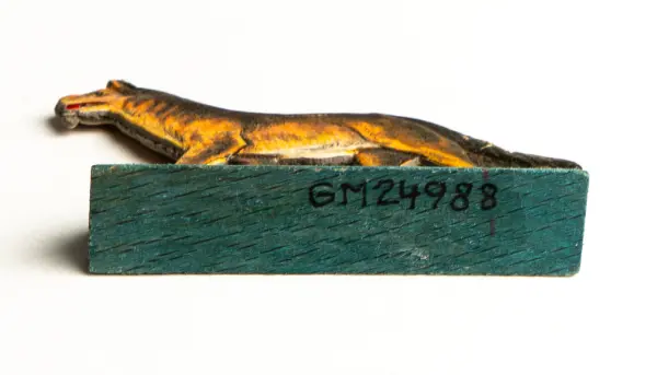 • Hund av figursågat lamellträ. Påklistrat litograferat papper i gult och brunt med grönt gräs, på båda sidor. Smal fotplatta av grönbetsat trä.