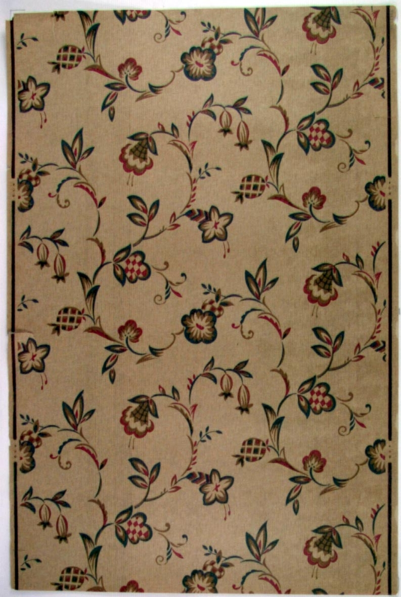 • Oljetryckstapet med yttäckande mönster av fantasiblommor i art-décostil, tryckta i blågrönt, ljusbrunt och rött mot effektmönstrad fond, Tapeten är tryckt på obestruken botten av gult genomfärgat papper.'