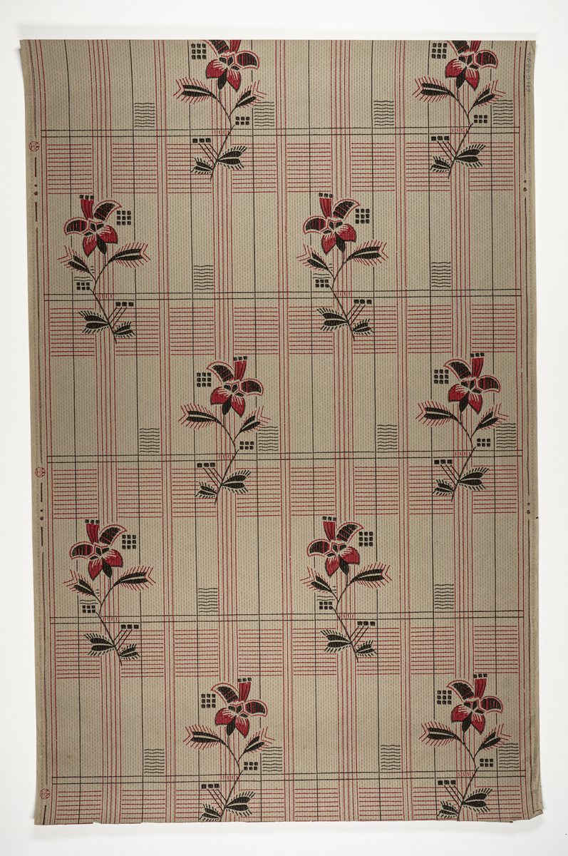 Enstaka stiliserade blommor med fantasifulla blad ovanpå rand-/rutmönster. Beigegrått genomfärgat papper med tryck i svart och ceris. Tapet med strödda blommor i art décostil mot rutmönstrad fond. Tryck i ceriserött och svart på obestruken botten av genomfärgat papper. Tillverkad vid Kalmar nya tapetfabrik.'