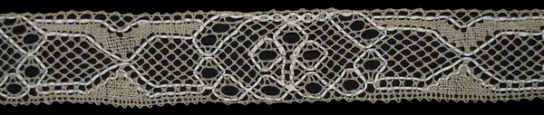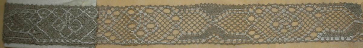 2 trådar 1 tr oblekt grått lingarn och till konturtråd 10 trådar 1 tr blekt vitt lingarn. Dalknyppling utförd med dubbelslag, vävbotten, brabantbotten och konturtråd. Mönstret bildar långa smala vävbottnar och ovala hål omgivna av konturtråd.