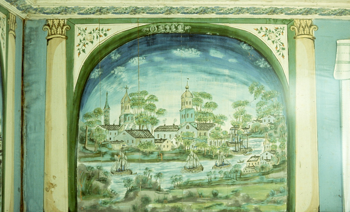 • Väggmålning "Gefle". Natur och bebyggelse, fartyg i farled.