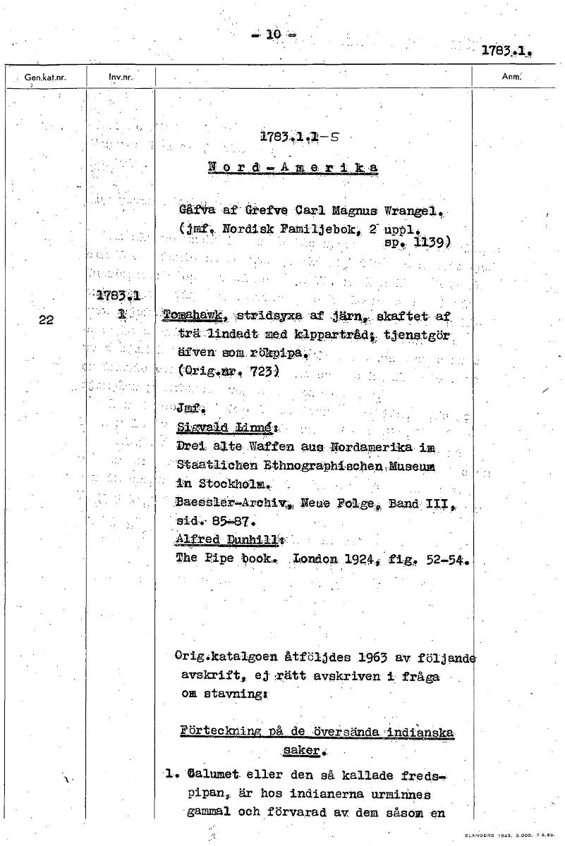 17-83,4. 1783.14-5 'ord.Amerika GedVa 'af Grefve Carl Magnus Wrangel., (jmf.. Nordisk Pamiljebok,, 2- uppl. 8N. 11739 22 -Tomahawk, :stridsyxa af _j4rn„,.. skaftet- af, 'trä lindadt med klppa.rtrådk, tjenstgör äfven- sota rb (-Orig.nr, 723) ' J ' Blgvald Itinnd-L Drel, alte- Waffen aug Nordom.erika 'Staatl.ichen Ethnographischen,MUseum in Stockholm., Taettler.f.Arclaiv7,„, Neue Fager., Eand-: sid... 83.=.87. 'Alfred DunhiIls ; , The Pipe book. 4ondon 1924,sts flig, 52-54.. Orig.katalgoen åtföljdes 1963 av följand avskrift, ej -rätt avskriven i fråga, stavning: Förteckning på de översända indianska saker 1 Calumet eller den så kallade fredspipan, är hos indianerna urminnees gammal och förvarad av dem såsom en [ocr]