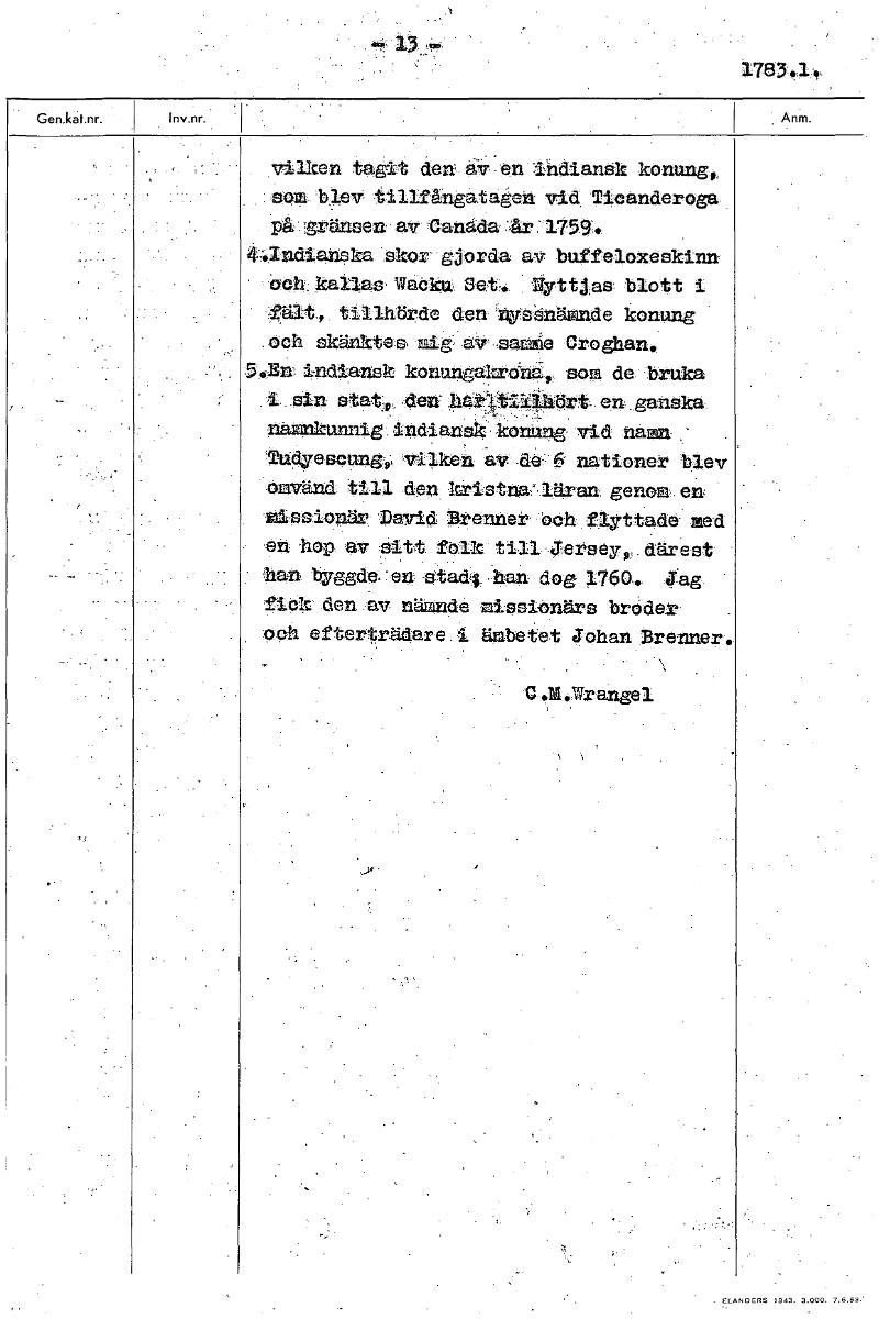 1783 1, vilken tagit den av en incliansk konung som blev tillfångatagen vid Ticanderoga på gränsen av -Canada år 1759. 4;Indianska skor gjorda av buffeloxeskinn och kaIlas, Wacku Set, Nyttjas blott i fält, tillhörde den nyss nämnde konung och skänktes mig av samme Croghan. 5. En indiansk konungakrona som de bruka i sin stat. Den har tillhört en ganska namnkunnig indiansk konung vid namn .... vilken av de 6 nationer blev omvänd till den kristna läran genom en missionär David Brenner och flyttade med en hop av sitt folk till Jersey, därest han byggde en stad. Han dog 1760. Jag fick den av nämnde missionärs broder och efterträdare i ämbetet Johan Brenner, C. M. Wrangel. [ocr]