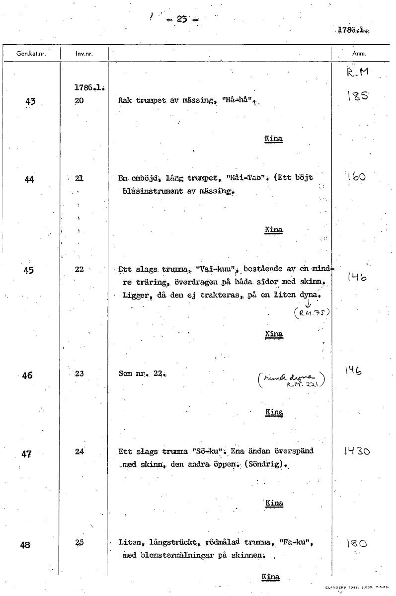 178641. 178644. U515 43 -go Rak trumpet av mässing, "liå=hån,. En omböjd, lång trumpet, "Hål.-Tao". (Ett böjt • 1, 60 bIåsinstrunent a.v mässing. Kina 45 22 Ett slags trumla, "Vai-kuu",,. bestående av dn mind re träring överdragen på båda sidor med skinn. Ligger, då den ej trakteras , på en liten dyna. CA 9-3") 46 '23 Som. nr,: 2 146 er,:k,,,,,b_JIAK-0- K., Kina 7 Ett slags trumla Sö-kunl. Ena ändan överspänd 1.43o med. skinn, den andra öp'pelt. (Söndrig).. Kina - Liten, långsträckt*, rödmålad truma "Fa-kung 1 0 med blomstermålningar på skinnen. . Kina [ocr]