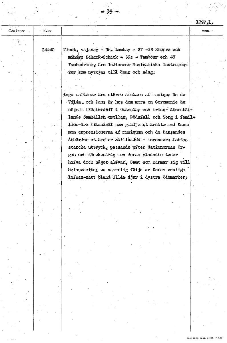 39 17941. 3440 Fleut, vajavay - 36.. Lambay - 37 -38 Större och mindre Schack-Schack - 39:: Tambour och 40 Tambourine, äro Indianens Musicaliska Instrumenter som nyttjas till dans och sång. Inga natio...