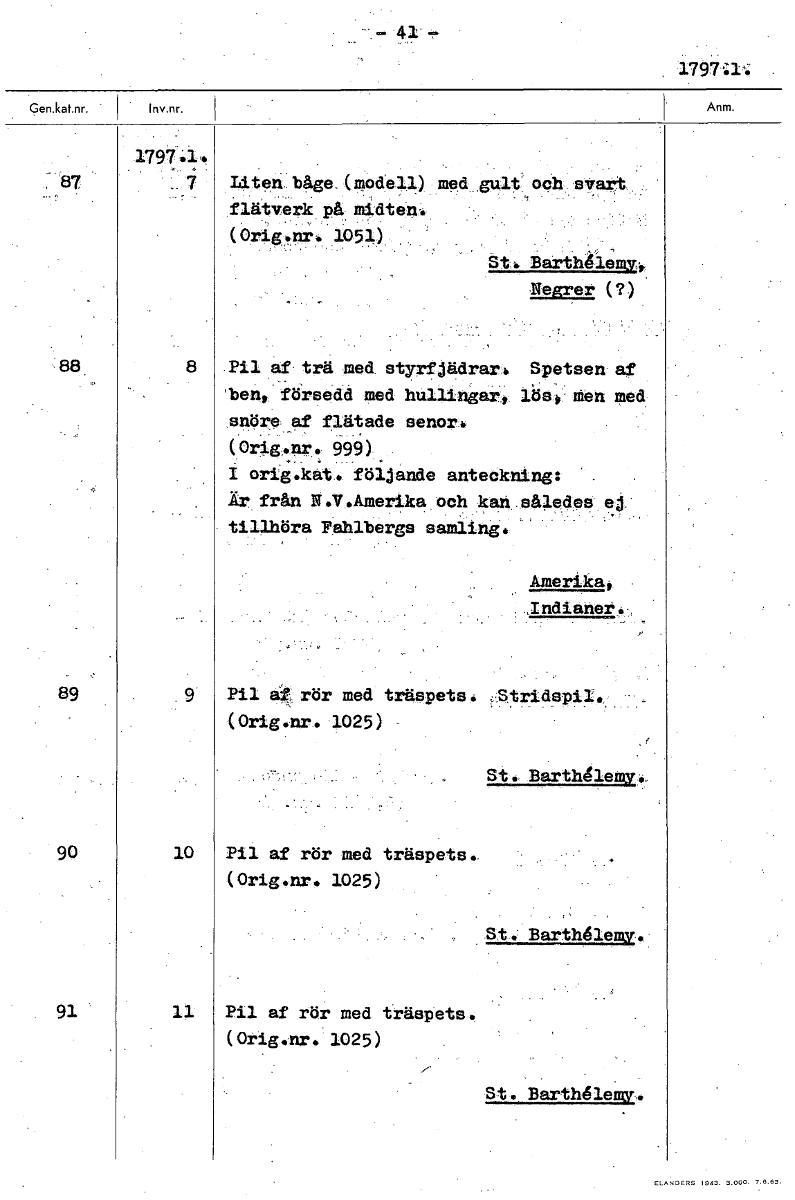 1797U.. . 1797.1. ,- 87 .. 7 Liten båge. (modell) med gult.: och stra,rt. flätverk på. midten. (Orig.nr. 1051) St Barth4lemy -Negrer (?) 88 8 Pil af trä med. styrfjädrar. Spetsen af 'ben, fÖrsedd med ...