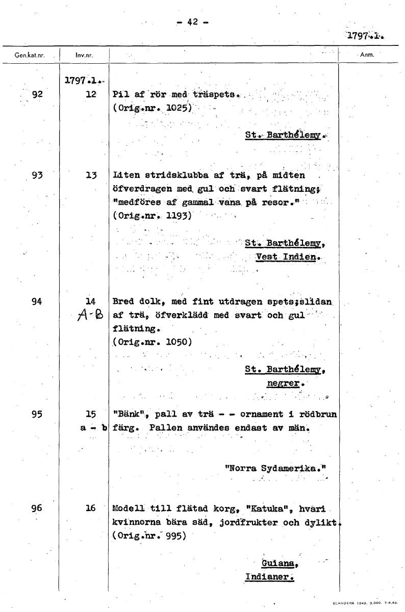 - 42 - 11797;1,4 1797 .1 .» 92 12 Pil af rör med tibäspets.. (Orig.nr. 1025j)' Barthigiemr..:. 93 13 Liten stridsklubba af trä, pä midten öfverdragen med. gul och evart flätning; "medföree af gammal v...