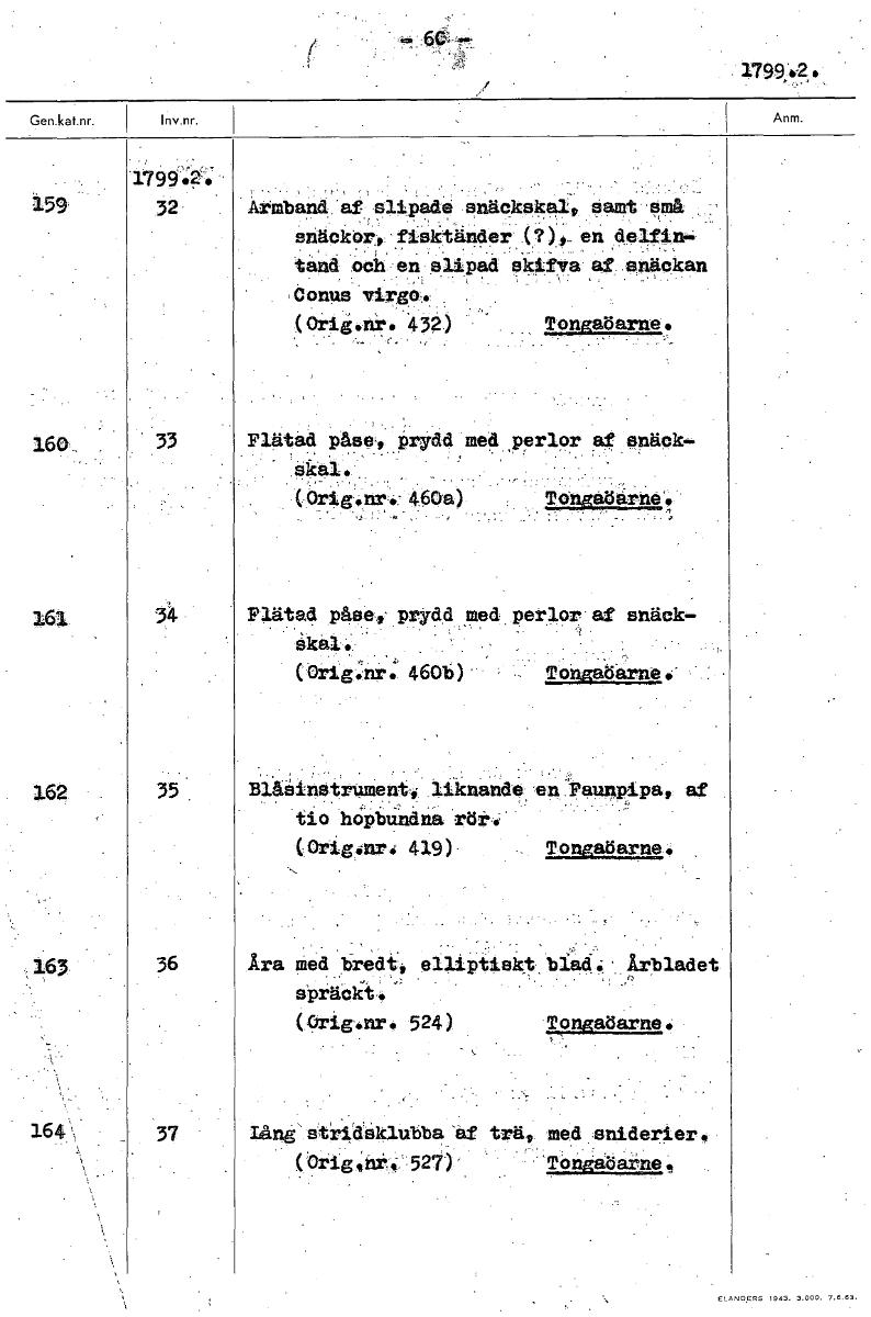 17992b2. 13,49'4;- 159 te Armband at slipade snäckskal. samt små snäckor, fisktäinder en delfin... tand och en slipad skifva af snäckan tonus virgo (Orig.nr: 432) Tongaöarne 160, 33 Flätad påse,, prydd med perlor af ~ck- . Skal. - (Or 460a) 161 34 Flätad påse, prydd med, perlor af snäck- . skal. . ( Orig:nr: 460b) Tongaöerne 162. 35 Blåsinstrument, liknande en )'ararapipa, af tio höPinindna rör: (Orignr. 419) Tongaöarne4 163 36 Åra med bredt. elliptiskt bla. Arbladet • spräckt. (Orig.nr. 524) Torigaöarne. 164 \ 37 Lång striäslaubbe 'af trä,. med sniderier. (örig.åri 527) _ 'Törrgaöarne. [ocr]