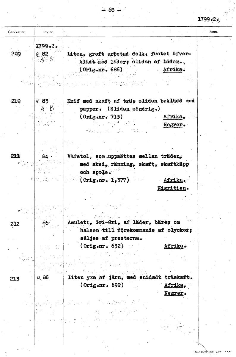 1799.2.' 1799 2. 209 2_82. groft arbetad dolk, fästet öfver- klädt.måd 1 er; alidanaf läder., (Orig.nr. 686) Afrikai 210 C 83 Knif med skaft af trä; slidan beklädd med papper.: ASlidan,söndrig.) (Orig...