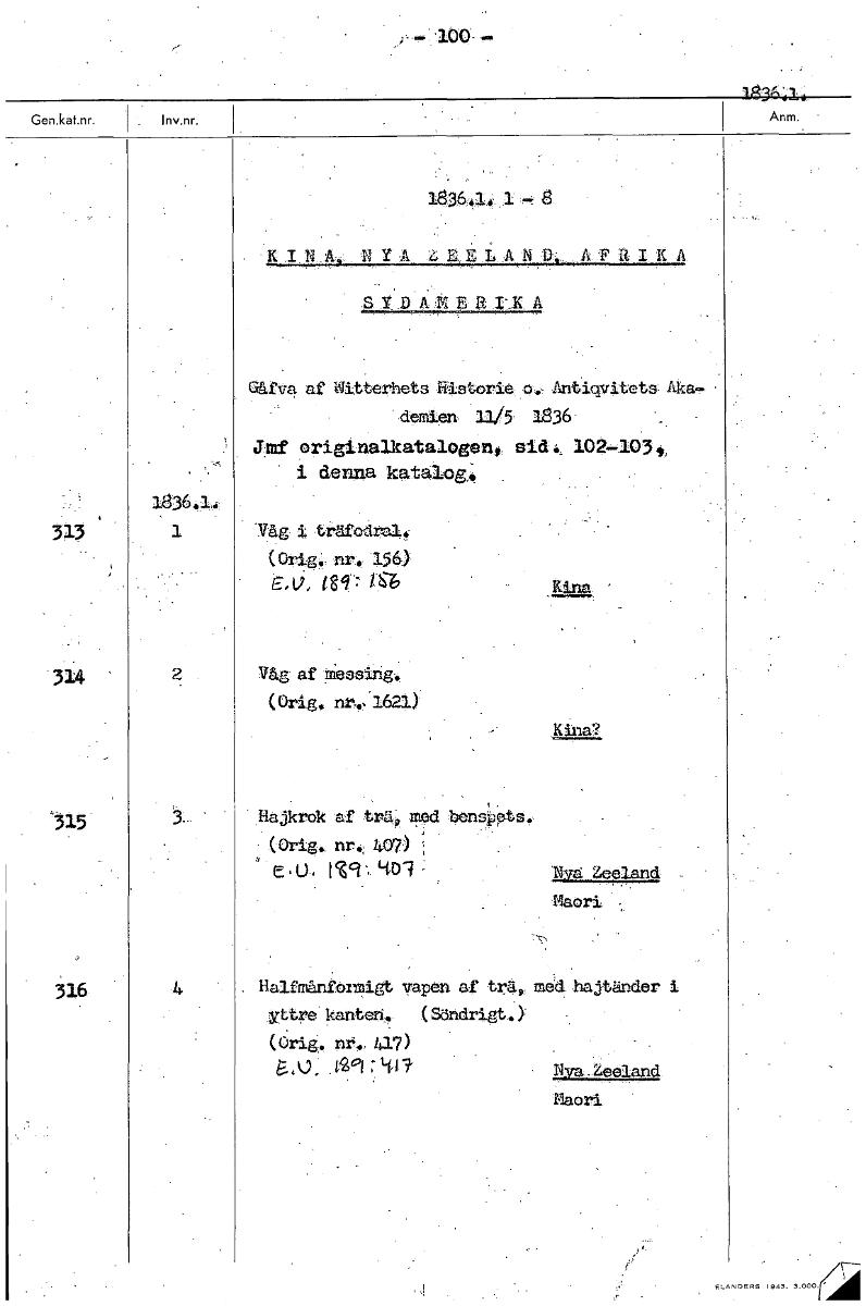 183A.1 1836.1. I KINA NYA E L'AND F SYDA Gårva af rhets Historia o. Antiqv tets Aka- demien 11/5 1836 Jmf originalkatalogen, 102-103t i denna katalog. 1836.1. 313 1 Våg i träfod (Orig. nr. 156) tgerig6 Våg af itiessing. (Orig. nr., 1621.) Kina? '315 liajkrok träi, mgd bens sts. (Orig. nr. 407) ; e .1). IV1', `Mg - Nya Zeeland Maori 316 4 Halfmiinfongigt vapen af tras,, med hajtände yttre kanten. (Söndrigt.Y (Orig. nr., 417) Nya .ZeeIand Maori .,,,.......3..00. r,/ [ocr]
