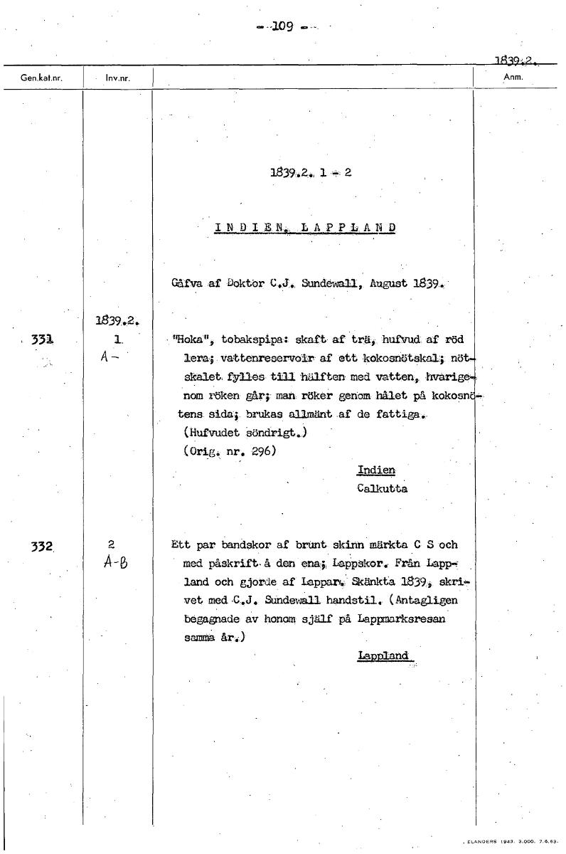 109 839-P 1839.2., INDIEN LAPPLA D Gåfva af Dokter C.J. Sunde wall, August 1839. 331. 9Hoka"„ tobakspipa: skaft af trä, hufVud af' röd A- Ieraf vattenreservoir af ett kokosnötskal; nö skalet, fyllas till .hälften med vatten, hvarige nom röken går man röker genom hålet på kokosn' tens sida; brUkas allmänt _af de fattiga. (Nufvudet söndrigt.) • (Orig. nr. 296) Indien Calkutta 332 Ett par bandskor af brunte skinn märkta C S och med påskrift, å den ena; Lappskor. Från Lapp-, land och gjorde af Lappar.' 18399 skri- vet med -e.J. Sundewall handstil. (Antagligen begagnade av honom själf på Lappmarksresan sa mima år.) Lappland [ocr]