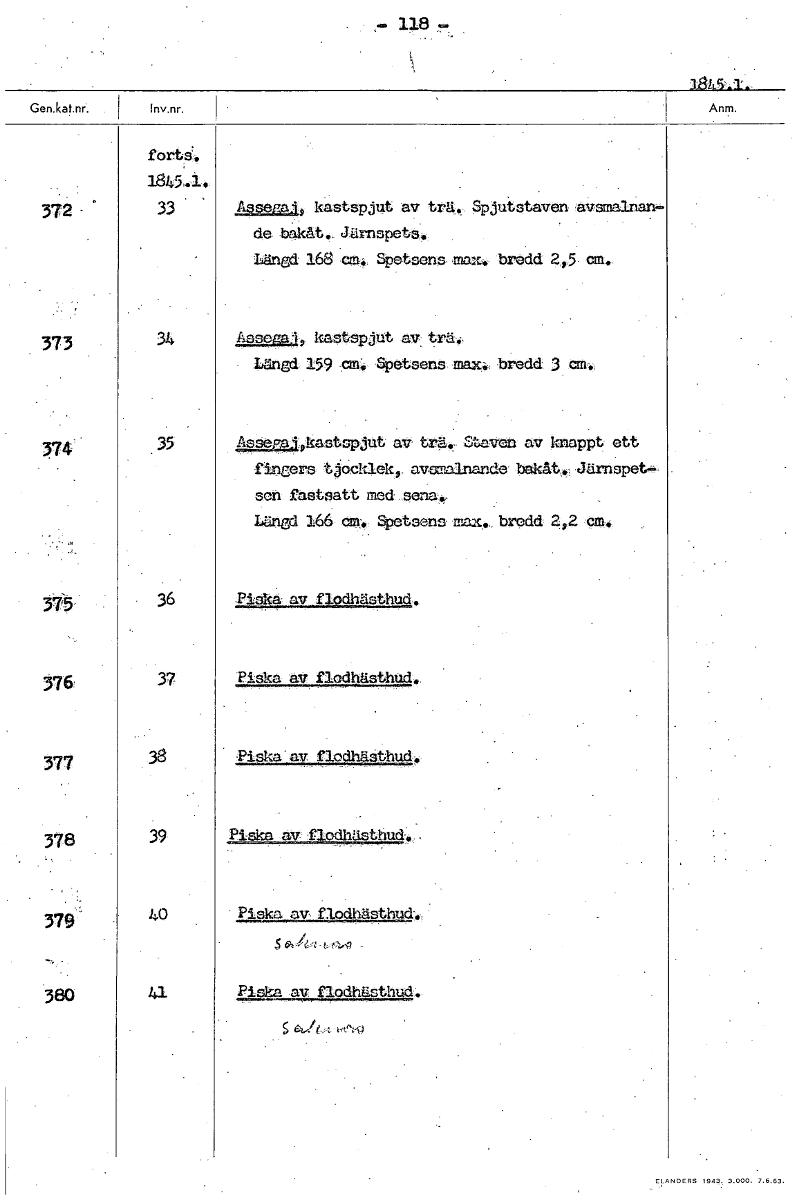 3att.5.1. forts', 1845.1, 372 - 33 AsseRaj$ kastspjut av trk. SPiutatavenavsmalnan- de bakåt, Järnspeta. Längd 168 em. Spetsens- bredd 2,5 • 373 34 Assesal., kastspjut av. trå, Längd 159 cmf. tsens max, bredd 3 cm.. 35 ssepa.tkastspjut av trä„ Staven av knappt ett fingers tjeckisk avsmalnande bakåt.Järnspet.,. son fastsatt med.pena, Läned 166 em:4, tsens. m^x,bredd 2,2 • 3775 36 Pipka av flodhästhud. 376 37 Piska av flodhästhud„ 377 Piska' v flodhäathudo 378 39 Piska avflodhästhud„, 379 40 Piska,av_flodhästbud, 5 380 41 PiskP av flodhästhud. 5 [ocr]