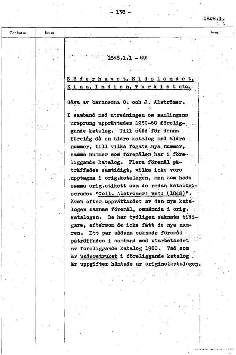 - 138 - .1E348-,1. . 1848.1.1. 6.93 Söderhavet,E.1d,aland.et,. Kina,Indien,Turkietetc. Gåva baronerna Oi och J. Alströmer. I samband med utredningen om samlingens ursprung upprättades 1959-60 förelig-...