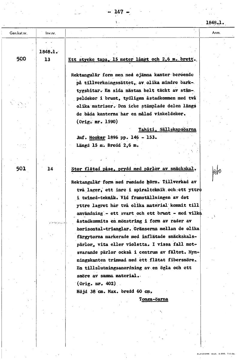 147 1848,1.- 500 13 Ett Stycke tapa. 15 meter lånAt och 2.6 m„brett., Rektangulär form men med °jäs= kanter beroende På tillverkningssättet, av olika mindre bark- tygsbitar. En sida nästan helt täckt ...
