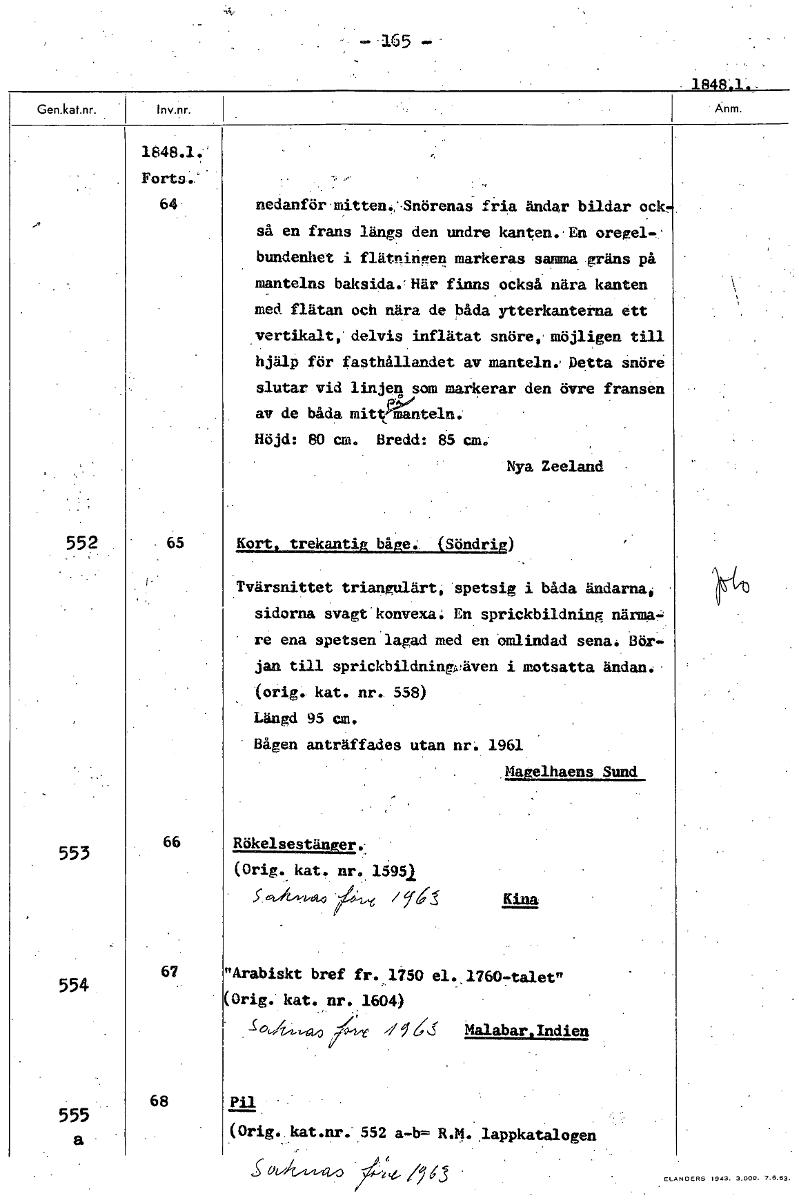5 1848.1 1848.1.' Forts. 64- nedanför mitten.:-Snörenas ria ändar bildar ock, så en frans längs den undre kanten. En oregel-. bundenhet i flätningen markeras samma gräns på mantelns baksida.'Här finns också nära kanten med flätan och nära de båda ytterkanterna ett vertikalt, delvis inflätat snöre, möjligen till hjälp för fasthållandet av manteln.. Detta snöre slutar vid linjen som markerar den övre fransen av de båda mitXinkteln. Höjd: 80 cm. Bredd: 85 cm. Nya Zeeland 552 65 Kort, trekantig båge. (Söndrig) Tvärsnittet triangulärt, spetsig i båda ändarna, sidorna svagt konvexa, En sprickbildning närma- re ena spetsen lagad med en omlindad sena. Bör- jan till sprickbildning;Aven i motsatta ändan. (orig. kat. nr. 558) Längd 95 cm, Bågen anträffades utan nr. 1961 Magelhaens Sund 66 Rökelsestänger. 553 (Orig. kat. nr. 15951 5 Kina 67 "Arabiskt bref fr. 1750 el. 1760-talet" 554 (Orig. kat.,nr. 1604) Malabar,Indien 68 Pil. • 555 a (Orig..kat.nr.'.552 a-b= R.M.,lappkatalogen /7‘,3 [ocr]