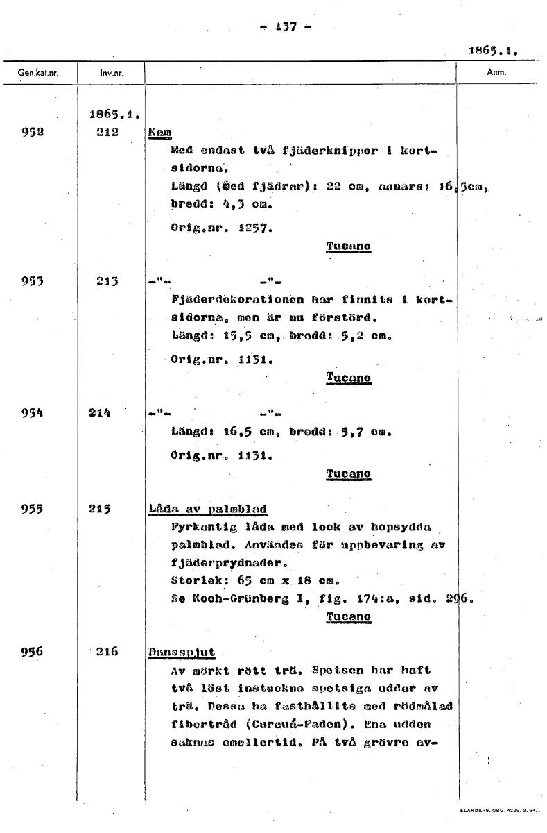 137 1865.1, 1865.1. 952 212 Kam Med endast två fjäderknIppor i kort- sidorna. Längd (Med fjädrar): 22 cm, annars: 16 bredd: 4,3 cm. Orig.nr. 1257. Tucano 953 213 Fjäderde orationen har finnits 1 kort-. sidorna ° men dr nu förstörd. Längd: 15,5 cm,. bredd: 5,2 cm. Orig.nr, 1131. Tucano 954 214 Längd: 16,5 cm, bredd: 5,7 cm. Orig.nr. 1131. Tucano 955 215 Låda av palmblad Fyrkantig låda med lock av hopsydda . palmblad. Användes för uppbeväring av fjäderprydnader. Storlek: 65 cm x 18 cm. So Koch-Grönberg 1, fig. 174:a, sid. ~sno 956 216 Dun spjut Av mörkt rött trä. Spetsen har haft två löst instuckna spetsiga uddar av trä. Dessa ha fasthållitS med rödmålad fibertråd (Curauå-Faden). Ena udden saknas emellertid. På två grövre av... [ocr]