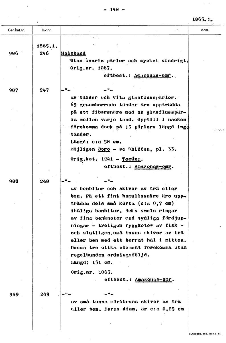 1.48 - 1865.1. 986 246 Halsband Utan Svarta pärlor och mycket söndri t. Or1g.nr. 1067. eftbest.: Amazonas-omr.. 987 247 av tänder och vita glesflusspärlor. 65 genomborrade tänder åro uppträdda p ett fibersnöre med en glasflusspär- la mellan varje tand. Upptill i nacken ' förekomma dock på 15 pärlors längd ing tänder. Längd: c:a 58 cm. Möjligen Bom - se Whiffen, pl 33. Orig.ket. 1241 - Tecdna. «tbc:st.: Ama,onns-omr. 988 248 -0- -n- av benbitar och skivor av trä eller ben. På ett fint bomullsendre.äro upp.. trädda dels små kOrta (c:a 0,7 cm) ihåliga ~bitar, dels smula ringar av fina benknotor med tydliga fördjup- ningar troligen ryggkotoe av fisk och slutligen: små tunna skivor av trd eller ben med ett borrat hål i mitten. .Dessa tre olika element förekomma utan regelbunden ordningsföljd. Längd; 131 cm. Orig.nr. 1063. . °Mest.: åmazones-omr. 989 249 . av små tunna mörkbruna skivor av trä eller ben. Deras diam. är c:a 0,25 cm [ocr]Stäng