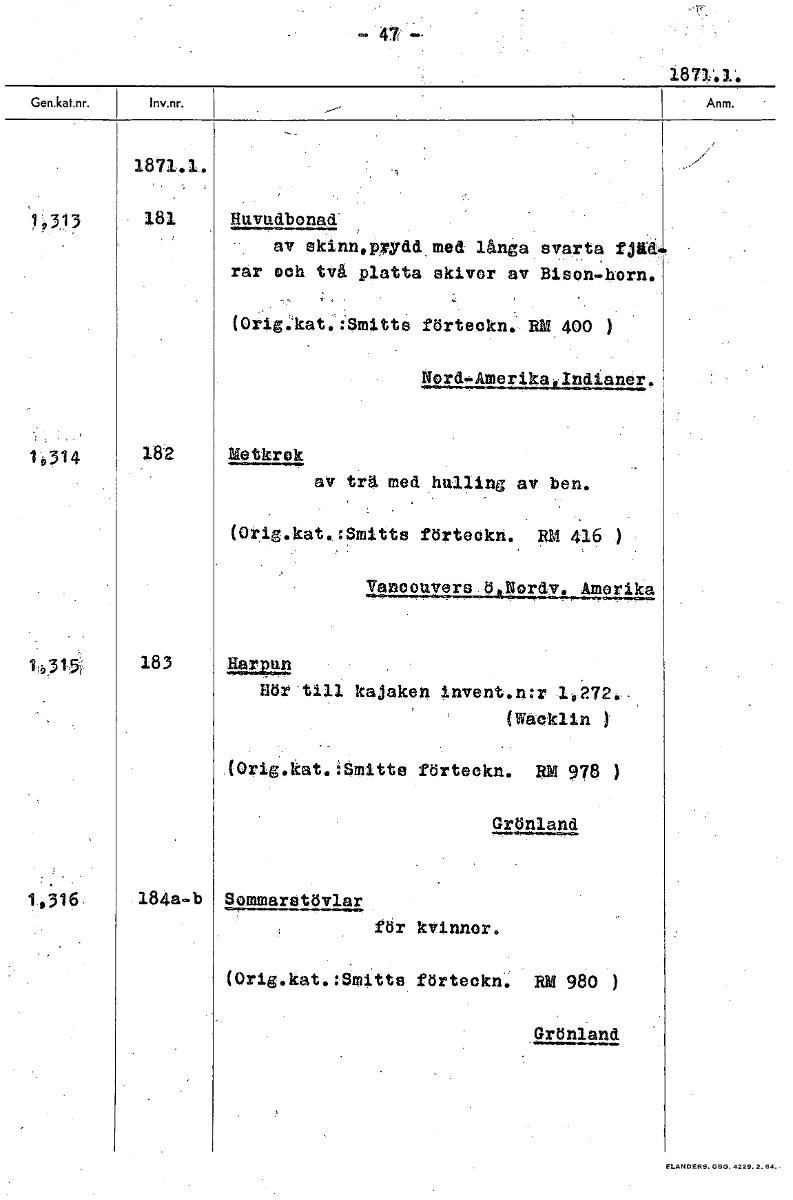 — 47 -- 1871.1`. 1871.1. )?3, 3 181 Huvudbonad av skinn.prydd,med långa svarta fjäd. rar och två platta skivor av Bison...:born. (Orig:-kat.:Smitts förteokn. RM 400 ) ROr4..!JAMPR'lkatindl.aner 19314 182 Metkrok av trä med hulling av ben. (Orig.kat.:Smitts förteokn. RM 416 ) Vanoouvors ö Nordv. Amerika 1315:i 183 Harpun Hör till kajaken invent.n:r (aoklin ) (orig.kat.iåmitte förteckn. RM 978 ) Grönland 184a.b Sommarstövlar för kvinnor. (Orig.kat.:åmitts förteckn. RM 980 ) Grönland [ocr]Stäng