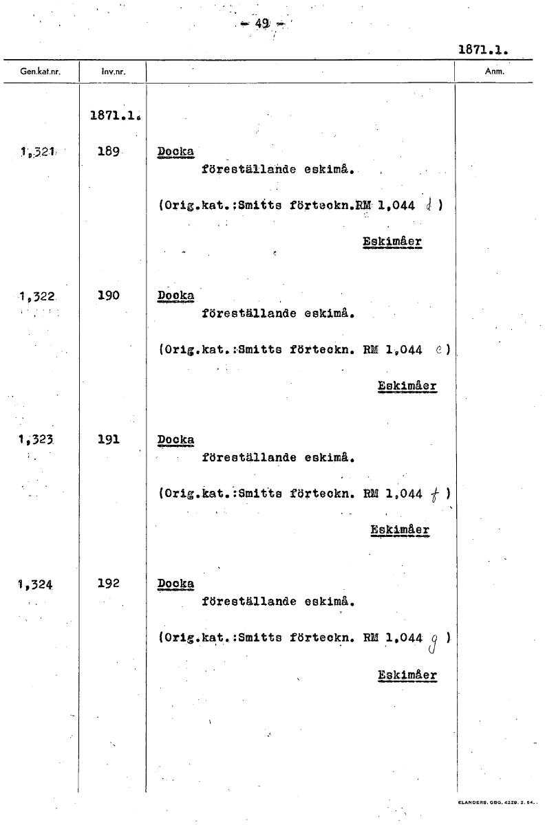 • 1871 1. 1871 1. 1'0;321, 189 Docka föreställande eskimå. (Orig.kat.;Smitts förteckn.1211 1,044 d ) Eskimåer 1 322 190 Docka föreställande eskimå. (Orig.kat.:3mitts förteekn. RM 1,044 Eskimåer 1 323 2.... Visa hela