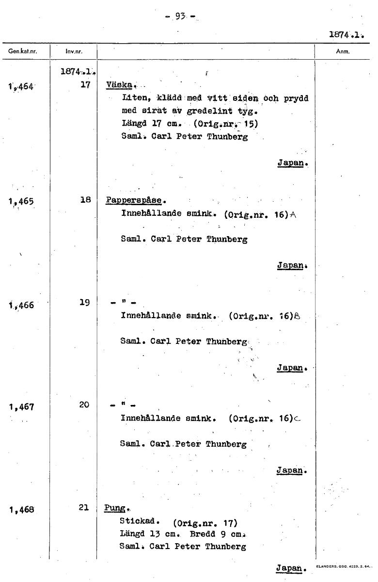 1874.1. 1874,1, 1 464' 17 Väska: . Liten, klädd 'med vitt sid'en,00 prydd med sirat aV gredelint tyg. Längd 17 cm. (Orig.nr.;15) Saml. Carl Peter Thunbei'g . Japan. 1 465 18 PaPPerenåse. Innehållande smink. Orig.nt. 16)-A Saml. Carl Peter Thunberg 1,466 19 Innehållande smink. (Orig.nr. 16)8 Saml. Carl Peter Thunberg. Japan,. • 1,467 20 Innehållande smink. (Orig.nr. 16)c_ Saml. Carl,Peter Thunberg Japan. 1,468 21 ZMDS. Stickad. (Orig.nr. 17) Längd 13 cm, Bredd 9 em. Semi. Carl Peter Thunberg Japan. [ocr]