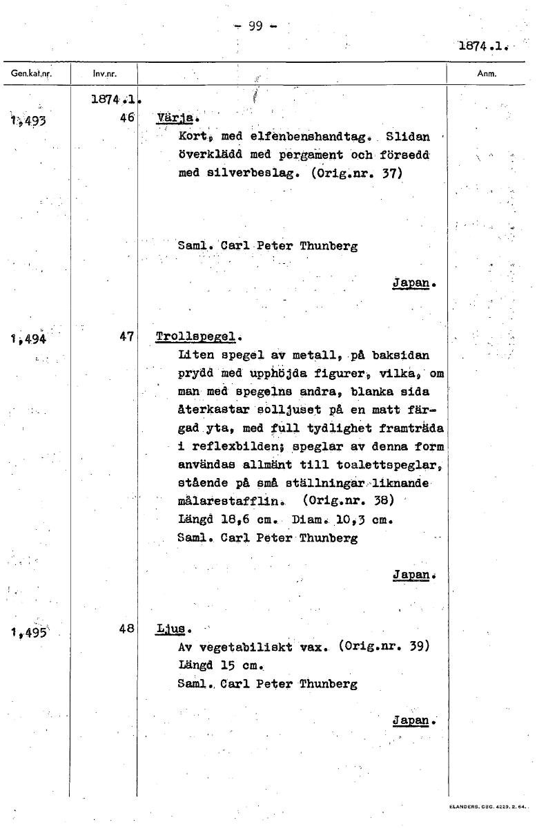-99- 1874.1 187 4. V9493 46 Värja. Kört', med elfenbenshandtag. Slidan överkläda med pergaåent och försedd med silverbeslag. (Orig.nr. 37) Saml.'Carl Peter Thunberg Japan. 1 i 49.4 47 Trollspegel. Lit...Visa hela