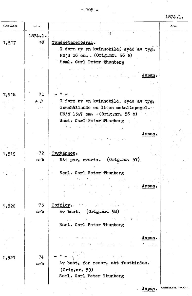 -105- 1874 il f,51.7 70 Tandpetarefodrl. " I form aV en kvinnobil4 sydd av'tyi. Höjd 16 dm. - (Orig.nr. 56 b) ' Saml. Carl Peter Thunberg ' Japan. f,51.714518 71 A -D I form av en kvinnobild, sydd av tyg, innehållande en liten metallspegel. Höjd l3'a cm. -Orig.nr. 56 c) Saml* Carl Peter' Thunberg Japan . 1,519 72 TYgkängox. a-b Ett par, svarta. (Orig.nr. 57) Saml. Carl, Peter Thunberg , japan, 1.520 73 Tofflor., a-b Av bast* (Orig.nr. 58) Saml. Carl Peter Thunberg Japan. 1,521 74 a-b kv, bast, för resor, att fastbindas. 59) Saml Carl Peter Thunberg jaPan. [ocr]