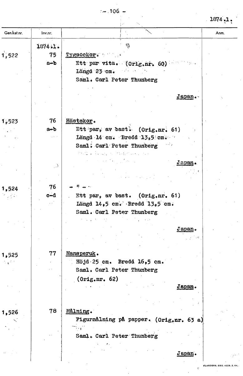 • 1874.1. 11522 2tt par, vita. 64) Längd'23'icm. ' Såll. Carl Peter. Thunberg Japap.. 19,523 76 Hästsker. - ao.b Fitt,par9' av bast'l (Orig.nr. 61) Längd,14 em. :Bredd'1395'em. Saml: Carl' Peter Thunber... Visa hela