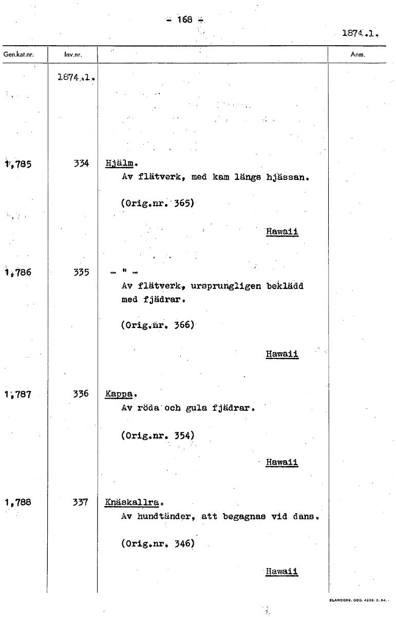 • - 168 1874.41. 1r, 785 334 Hjälm. Av flätverk, med kam längs hjässan. (Orig.nr.' 365) Hawaii 1,786 335 Av flätverk, ursprungligen beklädd med fjädrar. (Orig.år. 366) Hawaii 1'9787 336 Kappq,. Av rbda'... Visa hela